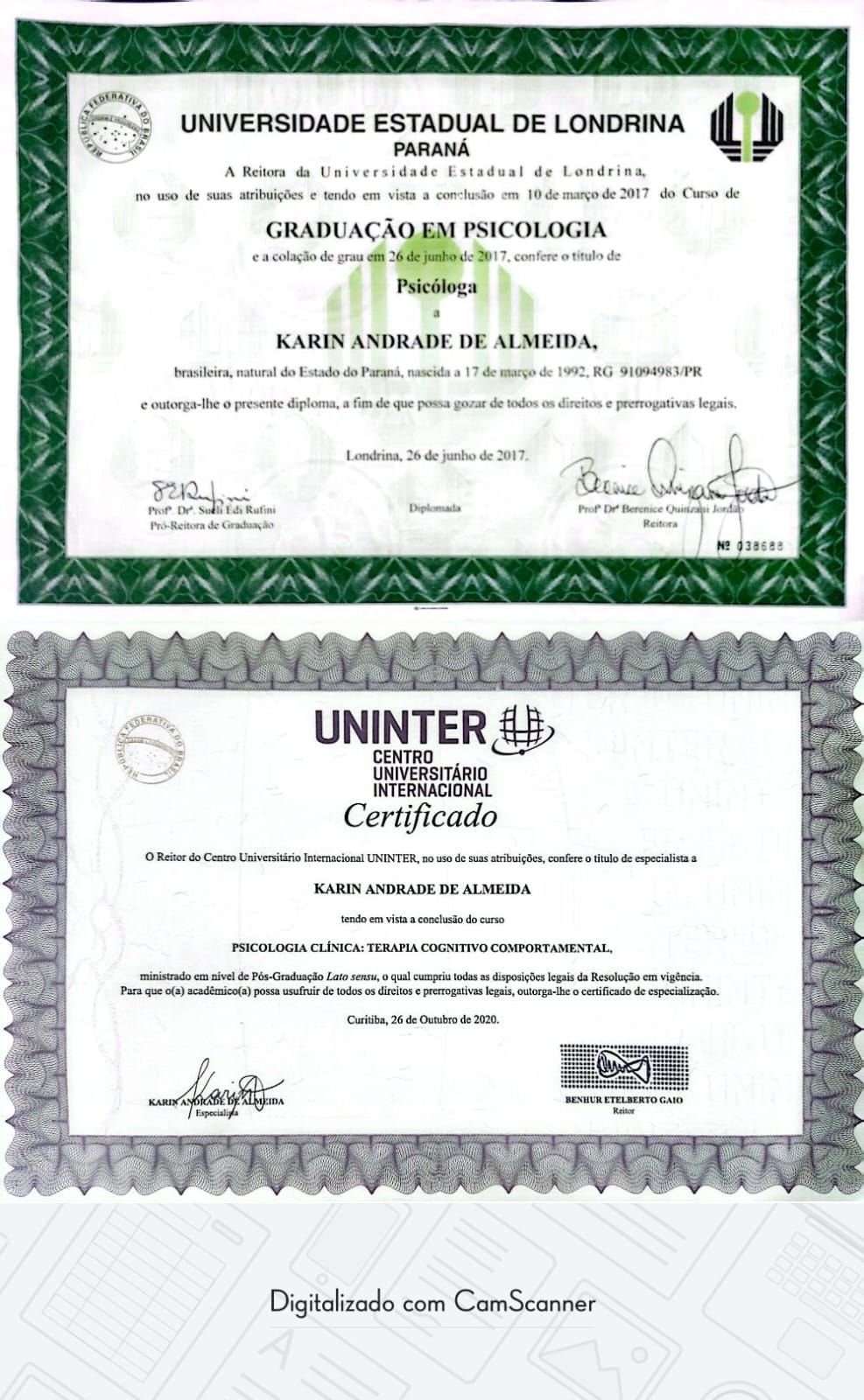 Sou Karin Andrade de Almeida, psicóloga formada pela Universidade Estadual de Londrina (UEL) e especializada em Terapia Cognitivo-Comportamental. Meu trabalho é ajudar você a cuidar da saúde emocional, compreender seus pensamentos, lidar melhor com as emoções e desenvolver estratégias práticas para enfrentar os desafios do dia a dia.